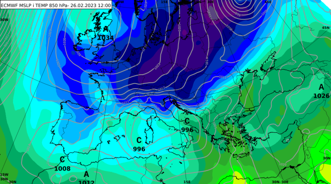 Očekivani nagli prodor hladnog zraka bit će vrlo snažan - temperatura na izobarnoj plohi 850 hPa past će i više od 12°C (na oko -8°C) u nešto više od jednog dana. Posljedice prolaska hladne fronte i jačanja ciklone bit će mjestimice obilnija kiša koja će u nedjelju u unutrašnjosti prijeći u snijeg. Nakon jakog juga i jugozapadnjaka zapuhat će sjeveroistočni vjetar, a na Jadranu žestoka bura.