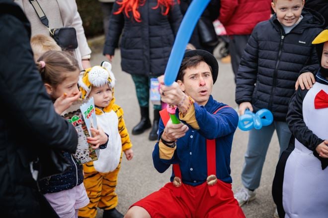Djecu je zabavila predstava s cirkuskim elementima u kojoj su i sami mogli sudjelovati na pozornici, a posebno je oduševljenje izazvala i djevojka na štulama. Posebno oduševljenje izazvale su maskote - Minne, Mickey, Stitch, Labubu i Baby Boss koji su s mališanima neumorno plesali i fotografirali se.