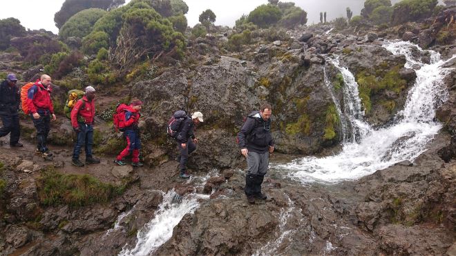 Sljedećeg dana ekipa je u Maranga selu podno samog Kilimanjara dobila lokalnog vodiča, od kojega su saznali za Kilimajaro znači 'bijela planina' (Kilima na swahiliju znači planina, a Njaro na jeziku Chagga plemena znači bijelo). - Pripadnici Chagga plemena pokazuju nam tunele iskopane u brdu koji su im služili kao sklonište za vrijeme rata s Maasai plemenom te sudjelujemo u njihovoj ceremoniji prženja i pripremanja kave. Uslijedila je posjeta najstarijoj ženi na svijetu za koju lokalci tvrde da ima 142 godine! Naravno, svaka od navedenih aktivnosti stoji popriličnu svotu tanzanijskih šilinga – podijelio je snama Tomislav neke zanimljivosti. Trećeg je jutra uzbuđenje članova ekspedicije poraslo, jer je slijedio uspon. - Kombijem nas prevoze do Machame gatea na kojem započinje naša pustolovina. Na gateu je velika gužva, nosači pakiraju prtljagu u svoje vreće, koje se tada važu i kontroliraju – zabranjeno je unositi jednokratnu plastiku u park! Krećemo polako kroz džunglu. Kad kažem polako, onda je to stvarno puževim korakom. Vodič nam određuje tempo uz neizostavni 'pole pole' (što doslovno znači polako polako). Džungla je predivna, bajkovita i nestvarna. Uspijevamo fotografirati majmune. Nakon sedam sati hoda dolazimo do Machame kampa. Šatori nas čekaju. Dok se smještamo počinje kiša, koja će nas pratiti svih šesta dana na planini. Četvrti dan nastavljamo naše kretanje prema Shira kampu koji se nalazi na 3840 metara nadmorske visine. Vegetacija se mijenja, i kišna šuma prelazi u vrijesište. Hodamo šest sati i putem srećemo prve planinare koji imaju problema s visinskom bolešću. Mi za sada odolijevamo. Zadnji dio puta počinje kiša, koja nas prati do kampa. Šatori nas ponovno čekaju spremni, ali mokri kao i dio naših stvari. Vršni dio planine skriva se u oblacima i nije raspoložen za pokazivanje, ali zato nam se prema jugu pruža pogled na Mount Meru, nešto nižu, ali iznimno lijepu planinu – kaže Tomislav.