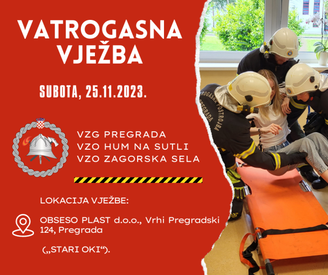 Vatrogasna zajednica Grada Pregrade u suradnji s Vatrogasnom zajednicom Općine Hum na Sutli i Vatrogasnom zajednicom Općine Zagorska Sela organizira zajedničku vatrogasnu vježbu u subotu 25. studenoga 2023..