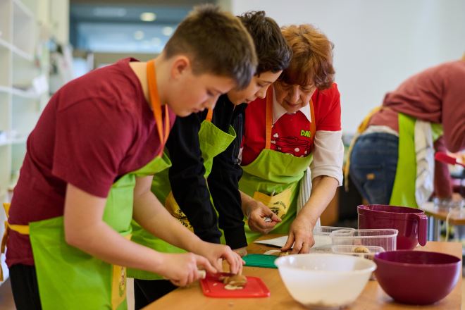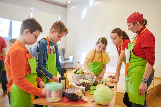 -Za temu ove radionice i nove polaznike odabrali smo nešto jednostavniju po pripremi, ali po temi jako važnu radionicu, a to je priprema međuobroka te smo je nazvali „NAMAZI – NAMAŽI, PA SMAŽI!“ Međuobroci su važni obroci tijekom dana, kako za djecu tako i za odrasle, jer su to obroci koje konzumiramo između svakodnevnih obveza (u školi, na poslu, prije i poslije glavnih obroka), tako da su nam često to i „slabe“ dnevne točke. U trenutku kad nas uhvati glad, umjesto, da imamo pripremljen/ili si pripremimo nešto jednostavno i zdravo, posežemo za grickalicama, pecivima, brzom hranom, koja nas zasiti, a nije bogata nutritivnim vrijednostima niti zdrava. Zato su zdravi namazi savršeni za sendviče, uz neki zdravi kreker, a pripremaju se, gotovo, od svih vrsta namirnica. Na radionici smo tako radili tri vrste humusa (slanutak s različitim okusima i začinima) i namaz od crvene leće, namaz od avokada (guacamole) i zeleni namaz od tofua i baby špinata (kombinirajući povrće), namaz (paštetu) od gljiva, te namaz od bučinih sjemenki i kremasti „sir“ – namaz od indijskih oraščića kao primjere namaza od orašida. Namaze smo mazali na domaće kruhove sa sjemenkama suncokreta i bundeve, te slagali u sendviče uz sirove komadiće povrća, salate i ukiseljeno povrće. Jutro smo započeli integralnim vaflima s kakaom, uz sladak i aromatičan napitak čaj latte i čaj od đumbira, a radionicu završili sirovim desertom, tortom s datuljama i bananama, posluženu s bio šlagom i sirupom od datulja. I ovaj put smo oduševili djecu novim okusima, za mnoge i po prvi put degustirane, opravdajući već poznatu stvar za naš projekt, a to je da zdrava hrana, itekako, može biti i fina' – dodala je i zaključila Snježana Krpes, voditeljica radionica zdravoga kuhanja.