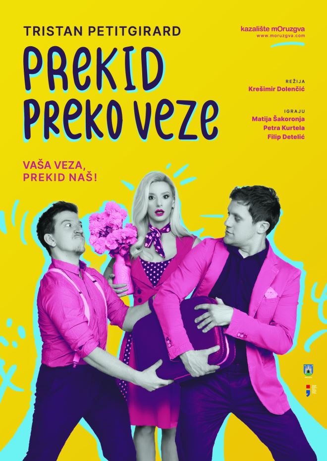 Predstava Kazališta Moruzgva Prekid preko veze, prema tekstu Tristana Petitgirarda, a u režiji Krešimira Dolenčića, u središte dramske radnje stavlja ljubavni trokut u sjecištima prošlosti, sadašnjosti i ne(izvjesne) budućnosti, pomičući granice tipičnih komedijskih zapleta i uvodeći elemente improvizacije kao razvojnih elemenata radnje. U glumačkom trokutu Filip Detelić – Petra Kurtela – Matija Šakoronja kao Eugen / Erik (savjetnik za prekide ljubavnih veza, bivši partner) – Đurđa (djevojka) – Vinko (sadašnji partner), izvanrednim glumačkim ostvarenjima i uvjerljivom, dinamičnom suigrom, donose ljubavnu priču o vezama i prekidima na moderan način, dinamično se poigravajući jezičnim zapletima, scenskim obratima, preplećući elemente improvizacije u interakciji s publikom, koja pristaje na sudjelovanje, potpuno se uključujući u radnju i postavši njezin neizostavan dio. Glumački trio pritom energičnošću, duhovitošću, izvrsnim scenskim pokretima, mizanscenom, glasovnim preobrazbama i ozbiljne slojevite međuljudske odnose utjelovljuje i donosi na duhovit način, razumljiv široj publici, međutim izbjegava banaliziranje i podilaženje. Tako slučajno (i/ili namjerno) uvučena prošlost (u odnosu Erik – Đurđa) mijenja sadašnjost (u odnosu Đurđa – Vinko) i utječe na razvoj budućnosti (prošlost oživljuje i donosi se u novom obliku u odnosu Erik – Đurđa) potencirajući pobjedu istinske ljubavi nasuprot površnih odnosa. Ipak, ostaje pitanje je li aluzija na Don Juana i plavu ptičicu samo dio prošlosti ili će prekid još jedne veze (braka) glavnoga junaka potencijalno otvoriti problematiku novostvorenoga odnosa. To, na kraju, nije ni važno jer je završetak očekivano neočekivan, pametno zbunjujući publiku i ostavljajući pitanja otvorenim. Jednostavna scenografija (djevojčin stan) radnju smješta u zatvoren prostor, oko centralnoga prostora kuhinjskoga stola, gdje se raspletljuju i razdanjuju ljubavni odnosi te se stvaraju novi, prostora iza (kuhinja) gdje se skrivaju prešućene riječi / tajne iz prošlosti ili prostor u kojemu se odvaja i kojim se odvaja te vanjski prostor (nevidljiv) iz kojega prošlost ulazi u sadašnjost. Tako je prostor važan funkcionalan i simboličan kôd značenja u predstavi, a motiv kuhanja / kuhinje / stola / pećnice (koja signalizira završetak procesa pripreme hrane) prenosi se simbolično na završetke odnosa, probleme u odnosima, moguća rješenja odnosa i početke novih veza. Uz višeslojnost značenja, mnoge zanimljive jezične i dramske obrate, simbole i kodove u iščitavanju dramske radnje, uz fantastična ostvarenja glumačkih uloga, spontanost u glumačkom izričaju, prirodnost tijeka događaja, uz uključenost publike, ova predstava s pravom zaslužuje biti na samom vrhu 2. Zabočke kazališne jeseni.