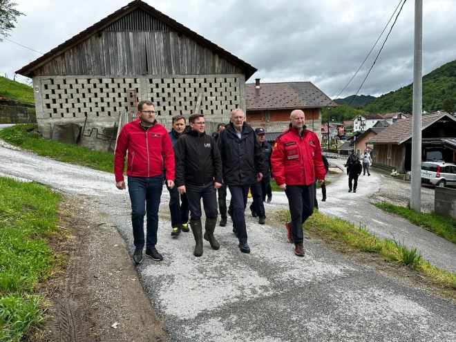 Ministar unutarnjih poslova Davor Božinović obišao je danas klizište koje se uslijed poplave otvorilo u Donjem Jesenju te prijeti kućama.
