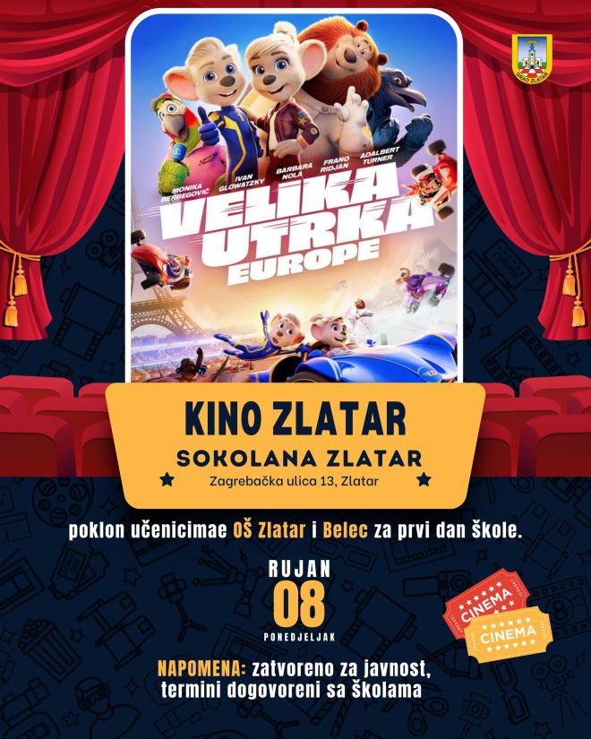 Kao što je i najavljeno, nedavno otvorena obnovljena zlatarska Sokolana započinje s prvim kino – projekcijama. A prvi će imati čast pogledati film u Sokolani najmlađi stanovnici Zlatara. – Sokolana je dobila vrhunsku kino opremu, projektor i ozvučenje, a kako bismo otvorili vrata budućim kino – projekcijama, odličili smo dati poklon svim našim osnovnoškolcima. Naime, prvog dana škole, u dogovoru s ravnateljima, svi učenici naše dvije osnovne škole, imat će mogućnost pogledati novi animirani film 'Velika utrka Europe' – kaže gradonačelnica Jasenka Auguštan – Pentek.