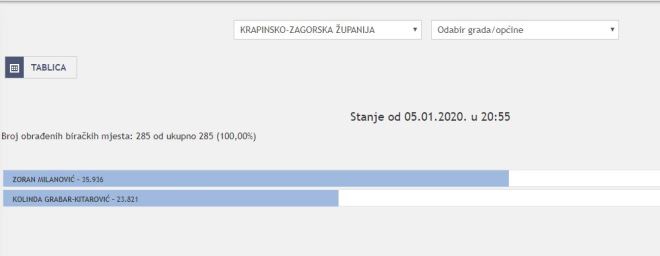 Što se Krapinsko - zagorske županije tiče, Milanović je pobjedu odnio u gotovo svim općinama i gradovima, Kolinda Grabar - Kitarović više glasova osvojila samo u Desiniću, Loboru, Mihovljanu i Novom Golubovcu