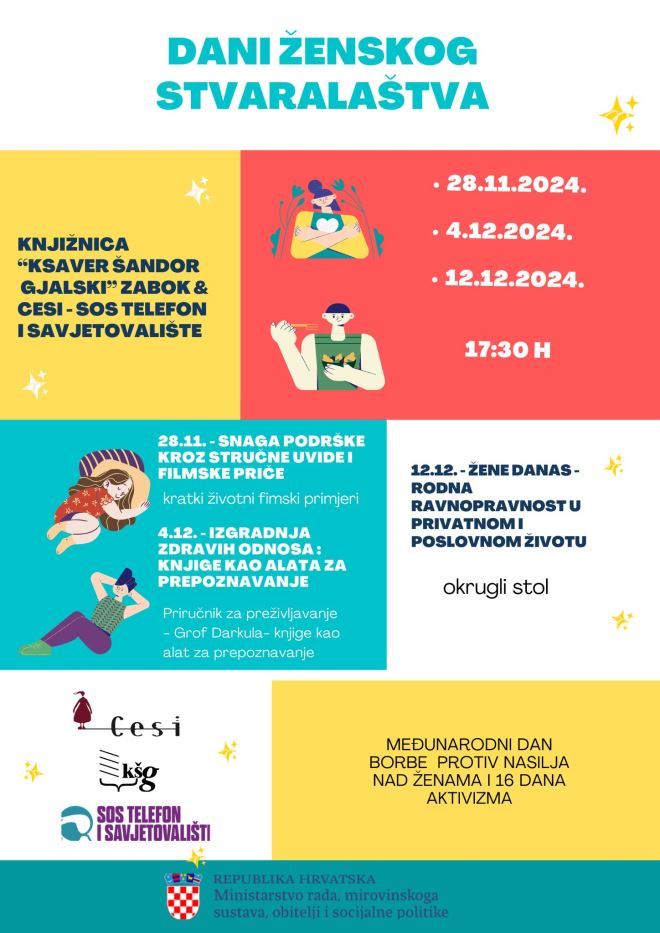 Povodom Međunarodnog dana borbe protiv nasilja nad ženama i 16 dana aktivizma, CESI - Centar za edukaciju, savjetovanje i istraživanje u suradnji s Gradskom knjižnicom "Ksaver Šandor Gjalski" Zabok, organizira niz događanja pod nazivom "Dani ženskog stvaralaštva", posvećenih osnaživanju žena, promicanju rodne ravnopravnosti i podršci zajednice.