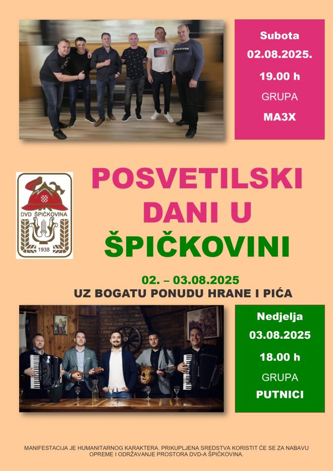Dobrovoljno vatrogasno društvo Špičkovina već tradicionalno organizira Posvetilske dane te i ovom prilikom poziva sve zainteresirane na vrhunski vikend zabave.