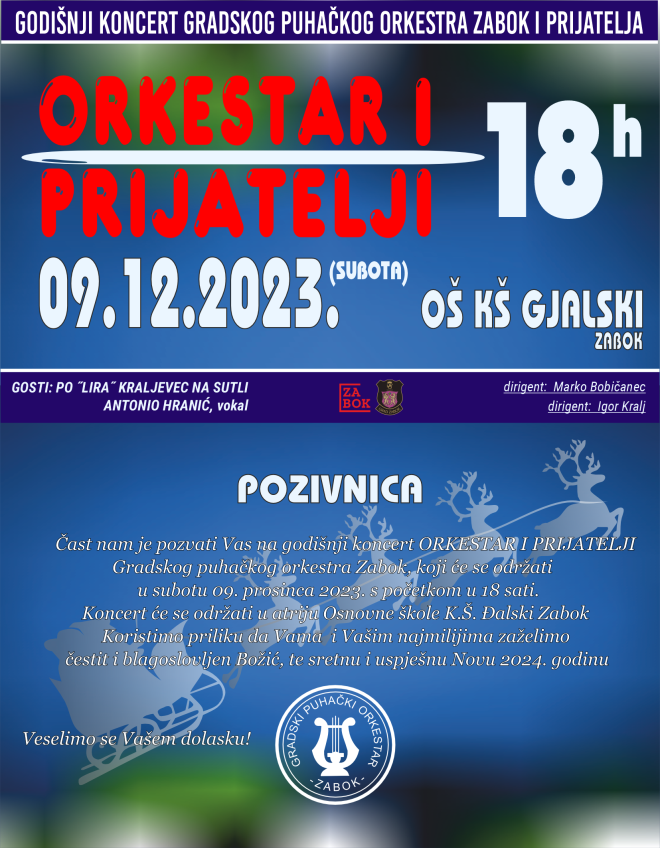 Gradski puhački orkestar Zabok već tradicionalno svake godine održava godišnji koncert pod nazivom ˝Orkestar i prijatelji˝. Koncert će se održati 09. prosinca 2023. godine (subota) u atriju osnovne škole Ksaver Šandor Gjalski, s početkom u 18. sati. Gosti koncerta su Antonio Hranić – vokal i Puhački orkestar „Lira“ Kraljevec na Sutli. ''Pozivamo sve građane i građanke grada Zaboka te ostalih općina i gradova Krapinsko zagorske županije da uz malo orkestralnih skladbi zajedno proslavimo ovo predbožićno vrijeme i ulazak u Novu 2024. godinu.'' – poručuju iz orkestra.