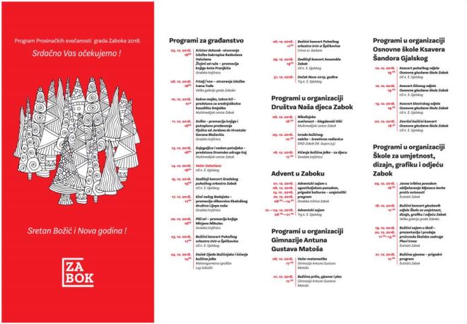 Dodajmo kako su neizostavna i događanja koja organiziraju Gimnazija Antuna Gustava Matoša, Osnovna škole Ksavera Šandora Gjalskog, ŠUDIGO i DND Zabok, a tu će biti i Advent u Zaboku odnosno Adventski sajam s ugostiteljskom ponudom i prigodni kulturno-umjetnički program na Gradskoj tržnici u Zaboku.