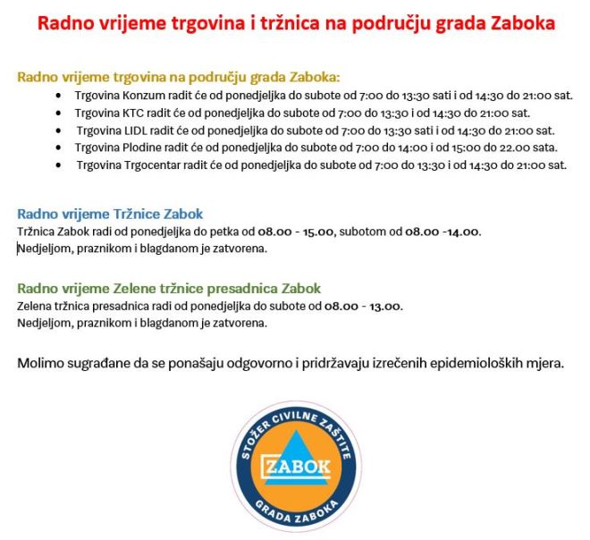 Od danas, 27.04.2020., se odlukom Nacionalnog stožera civilne zaštite popušta dio mjera zaštite od pandemije koronavirusa radi djelomičnog pokretanja gospodarstva.Omogućen je rad svim poslovnim subjektima koji obavljaju djelatnost trgovine, osim onih koji posluju unutar trgovačkih centara. Trgovine će smjeti raditi svaki dan osim nedjelje, praznika i blagdana. U objektima u kojima je radno vrijeme duže od 10 sati, obavezno je organiziranje dvokratnog radnog vremena, a prekid rada ne može biti kraći od jednog sata kako bi se prodavaonica adekvatno očistila i dezinficirala te da se zamijene radnici, poručili su iz Stožera civilne zaštite Grada Zaboka.