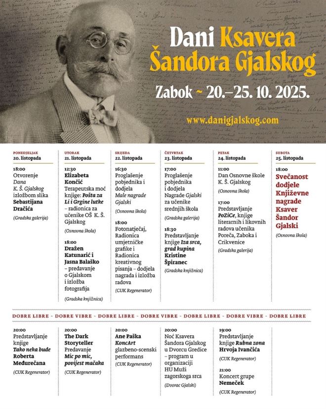 - Najavljujem tjedan pun kulturnih događanja, od promocija knjiga do koncerata i predstava. Želim da svatko u ovom tjednu pronađe nešto za sebe. Zabočani su izrazito ponosni što je jedan ovako veliki pisac potekao iz njihove sredine, a naša osnovna škola s ponosom nosi njegovo ime. U Zaboku djeluje Odbor za očuvanje kulturne baštine Grada Zaboka koji radi na očuvanju lika i djela Ksavera Šandora Gjalskog - izjavila je gradonačelnica.