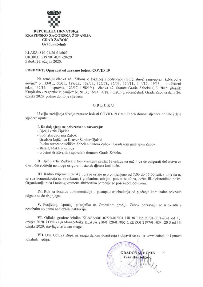 Danas 26. ožujka 2020. godine gradonačelnik Grada Zaboka donio je odluku kojom se produžuju mjere sprječavanja širenja zaraze koronavirusom koje se odnose na rad Gradske uprave, gradskih institucija te korištenje gradskih prostora i dječjih igrališta.