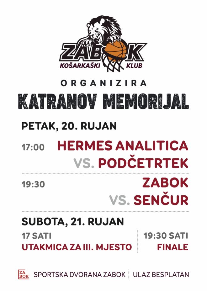 U petak i subotu u Zaboku će se odigrati "Katranov memorijal", na kojem će ove godine uz Zabok nastupiti i Hermes Analitica, te slovenski prvoligaši Šenčur i Podčetrtek. Turnir u petak u 17 sati polufinalnim ogledom otvaraju Hermes Analatica i Podčetrtek, dok će u 19.30 sati snage odmjeriti Zabok i Šenčur. U subotu 21.9. u 17 sati će se odigrati utakmica za 3. mjesto, dok će se finalni ogled odigrati u 19.30 sati.