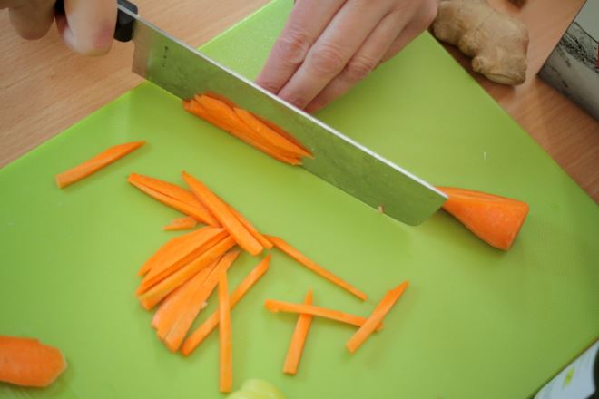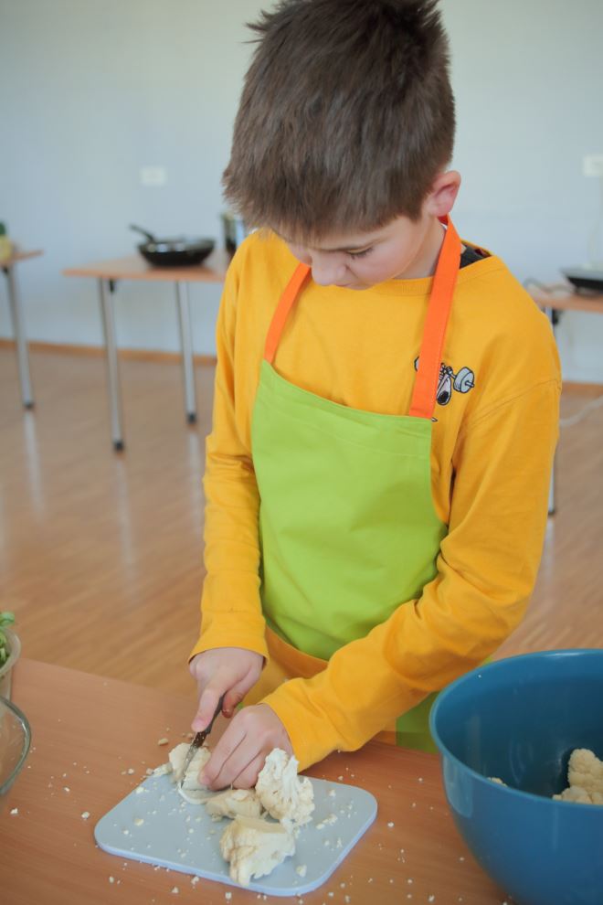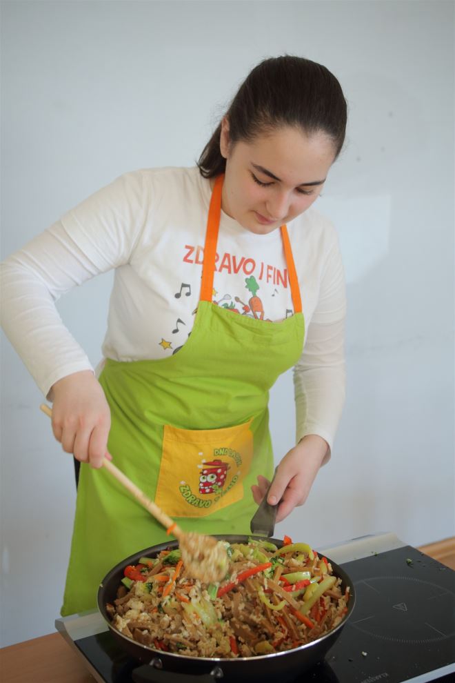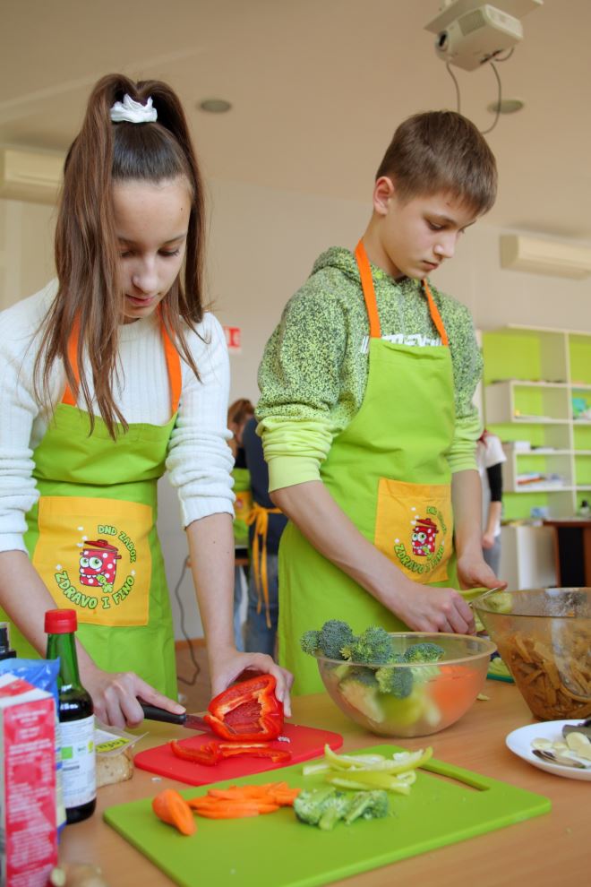 Glavna tema radionice bila je predstaviti djeci namirnice, tehnike pripreme hrane i tehnike rezanja, a opet sve u skladu sa sezonskim principom i uravnoteženim obrocima. Ovaj ciklus radionica bit će svojevrstan praktikum, jer je vrlo važno da se djeca kroz vještine potrebne u kuhinji i tehnike kuhanja i pripreme hrane, upoznaju sa zdravim (i finim) obrocima. Za prvi praktikum demonstrirali smo različite tehnike rezanja povrća na štapiće i trakice za rižoto u woku, kolutove i polumjesece za pizzu, veće komade voća i povrća (primjerice za juhu od cvjetače i celera ili desert za kremicu od kuhanih jabuka i narančinog soka) i ribanje. Od načina kuhanja demonstrirani su: kratko prženje povrća za wok, kuhanje pod tlakom riže za rižoto, pečenje pizze u pećnici, tostiranje badema i sezama, blendanje zdravih proljetnih smoothieja od banane i maslaca od kikirikija i od banane, špinata, naranče, miksanje krem juhe i kremice za desert te kratko kiseljenje sezonske salata od crvenog radiča, matovilca i komadića svježe paprike. Djeca su puno naučila, zabavila se i bilo im je slasno, a to je najvažnije kod radionice – dodala je voditeljica radionica zdravoga kuhanja Snježana Krpes.