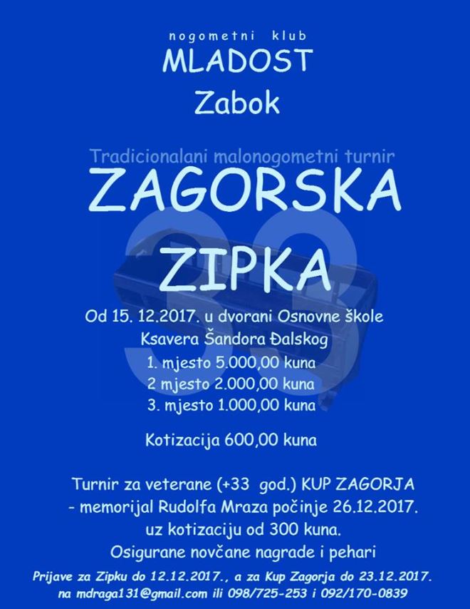 U organizaciji NK Mladost iz Zaboka održat će se 33. izdanje malonogometnog turnira „Zagorska zipka“, najstarijeg zagorskog malonogometnog turnira, koji zbog igranja na igralištu s mantinelama ima posebnu draž. Kao i proteklih godina turnir će se održati u sportskoj dvorani osnovne škole Ksavera Šandora Gjalskog u Zaboku.