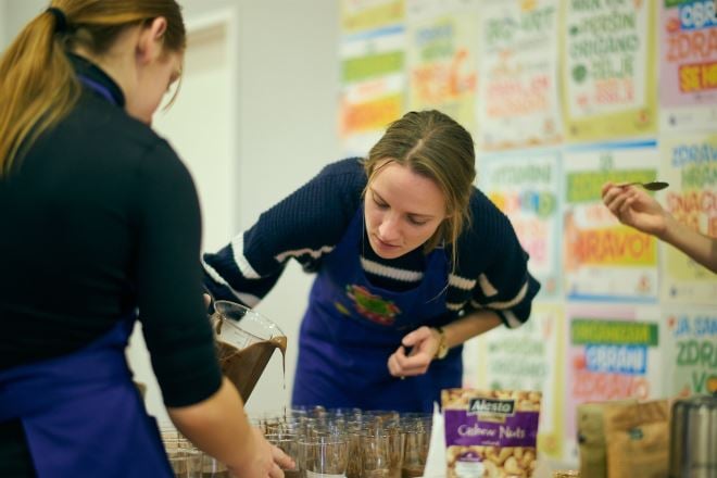 Spremala su se slasna božićno-zimska jela: za doručak domaći muesle miks od zobenih i kukuruznih pahuljica, sjemenki suncokreta i bundeva te suhih brusnica i grožđica tostirano sve u pećnici u jabučnom soku i s domaćim medom. Blagdanski ručak započeo je s predjelima - bijelom krem juhom od gljiva, brokule i krumpira i domaćom šarenom savijačom punjenom tofuom, gljivama, crvenim grahom, mrkvom, kukuruzom, uz francusku salatu s tofunezom, zapečenom bundevom te zimskom salatom s koromačem, radičem, matovilcem i narančom. Za glavno jelo pripremljena je i poslužena domaća veganska sarma s pireom od krumpira i crvene leće te beskvasni craft kruhovi sa sjemenkama. Sve smo zasladili bogatim čokoladnim zdravim desertima – sirovim pralinama (datuljama u čokoladi punjenim bademima i pistacijama) i čokoladnim mousseom od indijskih oraščića i brusnica. Zdravo i fino u najraskošnijem blagdanskom obliku!