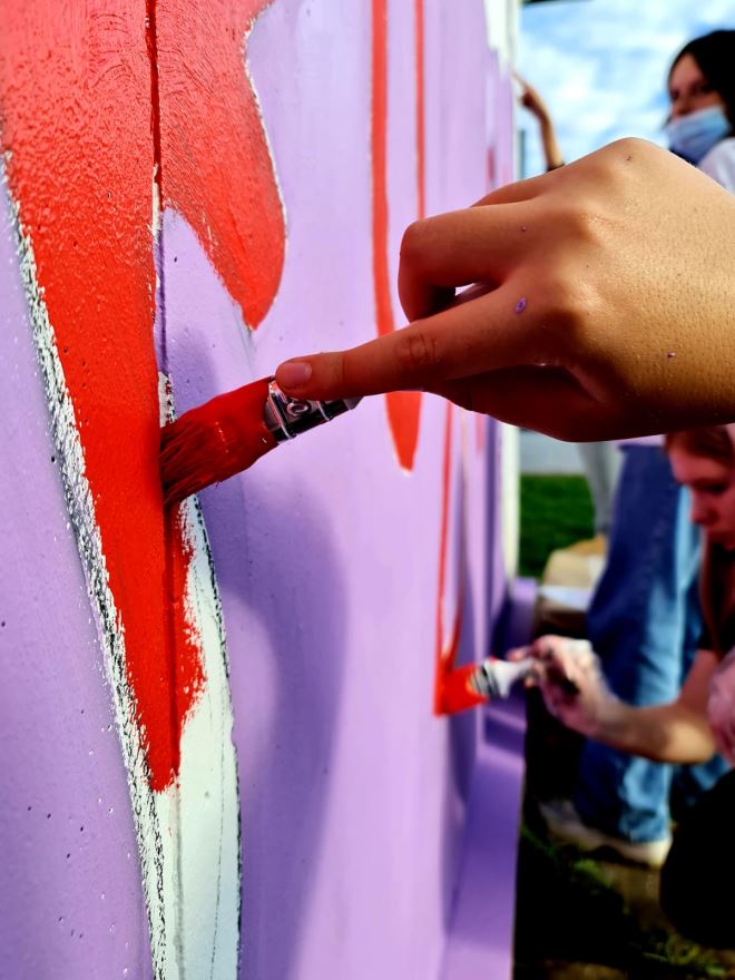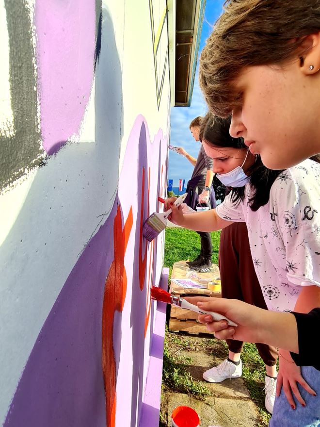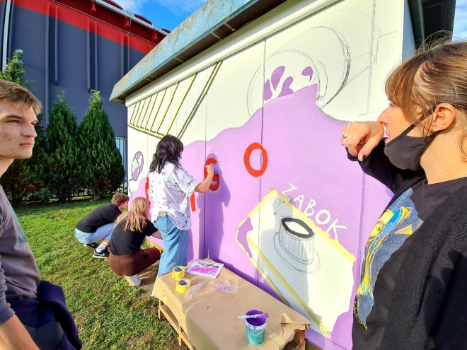 Od 29.9. do 2.10. u mnogim hrvatskim gradovima, među kojima je i Zabok, održala se manifestacija 'Hrvatska volontira'. Učenici 2.D razreda ŠUDIGO-a smjera industrijski i odjevni dizajn Petra Korač, Ana Kranjčec, Lea Ciglenečki i Tomislav Tovernić pod mentorstvom nastavnice Nikoline Ptičar oslikali su zid trafostanice u školskom dvorištu. Mural vizualno predstavlja identitet škole. Svaki motiv na muralu simbolizira pojedine odjele: klavijature glazbenu školu, miš web dizajn, kamera medijske tehničare, a prolivena boja koja povezuje sve navedene elemente u kompoziciji predstavlja odjel likovne umjetnosti i dizajna. 'Izbor boja se temelji na logu škole koji krase tonovi ljubičaste i žarko crvena boja. Pojednostavljenim motivima, plohama i crnom obrisnom linijom mural je povezan s preostala dva murala u školskom okruženju čiji su autori hrvatski street art umjetnici Marina Mesar OKO i Lunar. Akcija oslikavanja murala jedna je od mnogobrojnih akcija uređenja okoliša škole u kojima sudjeluju naši vrijedni volonteri, kaže ravnateljica Božica Šarić.
