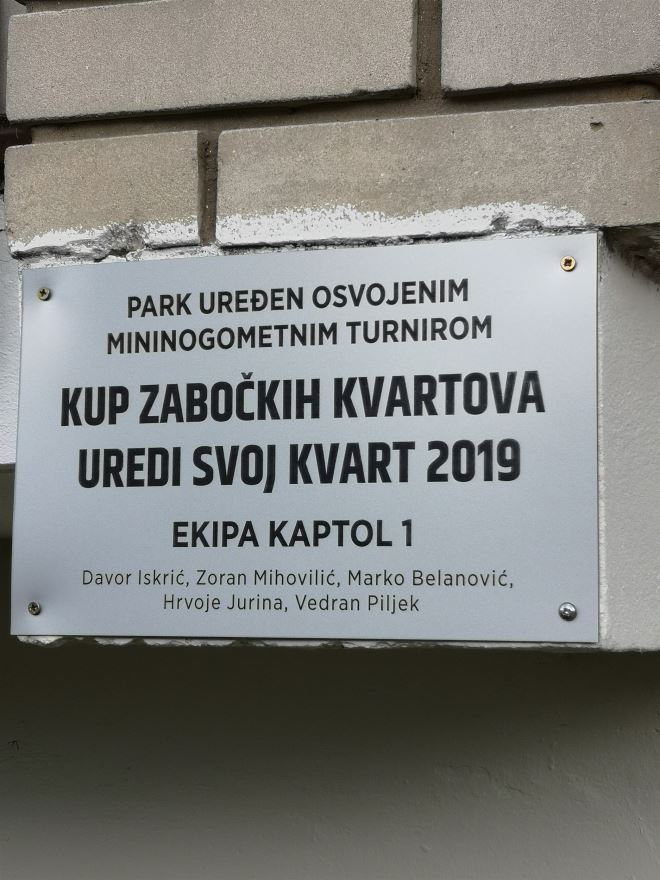 U organizaciji zabočke sportske udruge "Zabočki lavovi" otvoreno je novouređeno dječje igralište iza zgrade u ulici Marije Jurić-Zagorke u Zaboku, a odmah nakon toga izvučene su skupine za II. izdanje mini nogometnog turnira "Kup zabočkih kvartova - uredi svoj kvart". Nazočnim gostima i stanarima zgrade, koji su potpomogli ovaj event, prvo se obratio predsjednik SU Zabočki lavovi, Marko Deak. Slijedila je zanimljiva prezentacija samog projekta, a prikazan je i video-uradak s prvog izdanja turnira. Podsjetimo prošle godine osvojila ga je momčad Kaptol I, za koju su nastupali: Davor Iskrić, Marko Belanović, Hrvoje Jurina, Vedran Piljek i Zoran Mihovilić. Nagradu od 15.000 kuna odlučili su investirati u dječji park u ulici Mariji Jurić-Zagorke, koji sada zaista izgleda sjajno i spomenuta petorka ima pravo biti ponosna na sebe. Park je otvorio gradonačelnik Grada Zaboka, Ivan Hanžek.