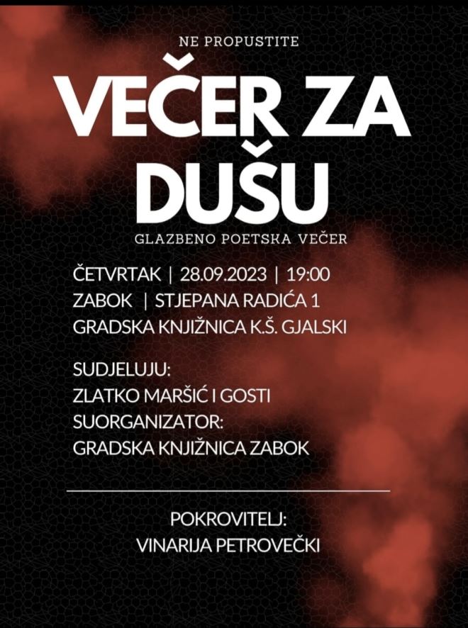 Večer za dušu ime je događaja koji će ovog četvrtka održati u Gradskoj knjižnici Ksavera Šandora Gjalskog na kojem će nastupiti Zlatko Maršić uz goste, a pod pokroviteljstvom Vinarije Petrovečki.