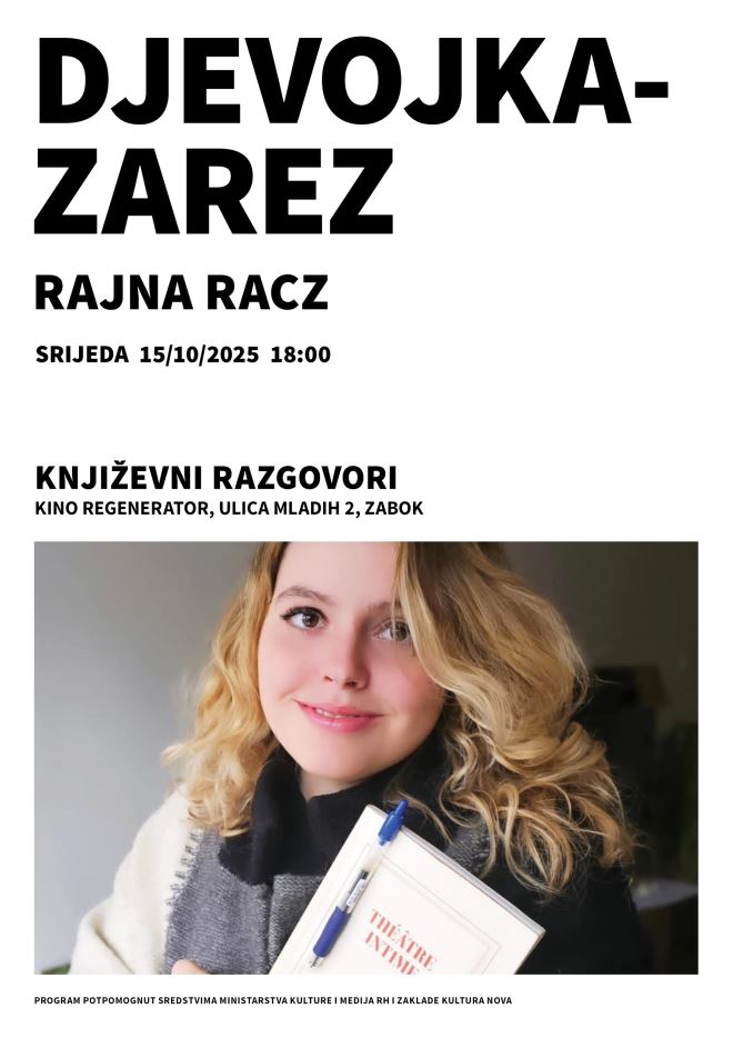U zabočki Regenerator u srijedu 15. listopada 2025. dolazi najpoznatija kazališna redateljica mlađe generacije Rajna Racz, koja će ovom prilikom predstaviti svoju zbirku poezije „Djevojka-Zarez“.