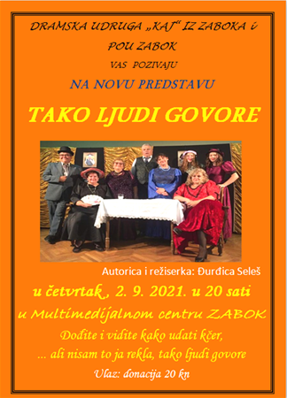 Dramska udruga „KAJ“ opet je na sceni s novom predstavom ‘Tako ljudi govore’, autorice i režiserke Đurđice Seleš, u dvorani Multimedijalnog centra (kino) u Zaboku. Predstava se održava u četvrtak, 2. rujna u 20 sati uz poštivanje epidemioloških mjera.