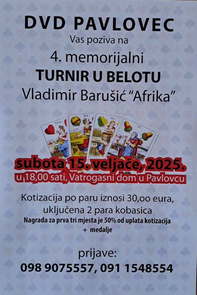 Dobrovoljno vatrogasno društvo Pavlovec poziva sve građane Pavlovca, Zaboka i okolice na tradicionalni 4. Memorijalni turnir u belotu Vladimir Barušić znanog kao Afriku, koji će se održati 15.02.2025. godine s početkom u 18,00 sati.