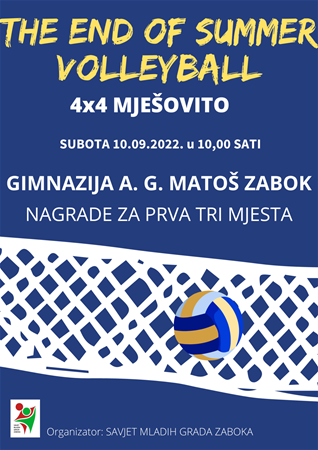 Kako bi obilježili završetak ljeta, Savjet mladih grada Zaboka odlučio je organizirati turnir u odbojci na pijesku. Sami turnir održat će se na novo uređenom odbojkaškom terenu kod gimnazije AGM u Zaboku, ovu subotu 10.09.2022. s početkom u 10 sati. Princip igre je 4 na 4 mješovitih parova. Kotizacije nema, ali zato ima puno nagrada i puno dobre zabave. Prijaviti se možete putem Facebook ili Instagram stranice Savjeta mladih grada Zaboka ili pola sata prije samog početka turnira.