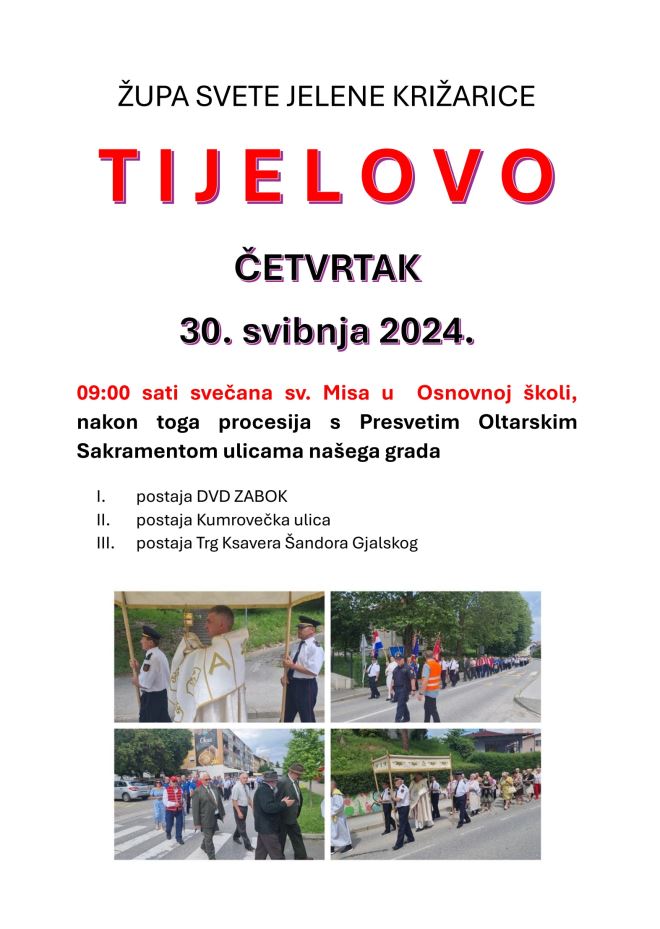 U četvrtak 30. svibnja 2024. slavi se svetkovina Predragocjenog Tijela i krvi Kristove – Tijelovo. Nakon svečane svete mise koja počinje u 09:00 sati u Osnovnoj školi uslijedit će procesija kroz grad.