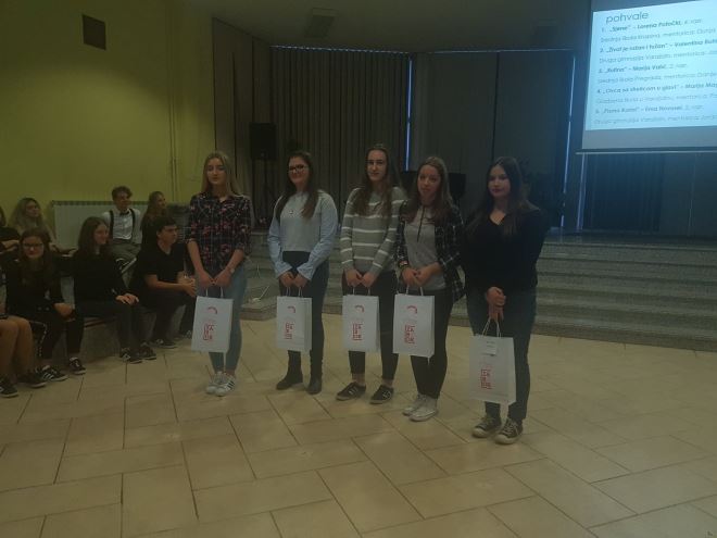 Spomenimo kako je pohvaljeno i pet radova. Lorena Potočki, učenica 4. razreda Srednje škole Krapina pohvaljena je za rad Sjene (mentorica Dunja Belošević), Valentina Buhin, učenica trećeg razreda Druge Gimnazije Varaždin pohvaljena je za rad Život je ružan i tužan (mentorica Jasminka Vuković Vidačić), dok je Marija Valić, učenica drugog razreda Srednje škole Pregrada pohvaljena za rad Rutina (mentorica Danijela Barilar Šterbal).