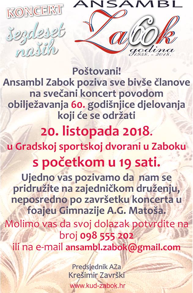 Ansambl Zabok slavi 60. rođendan velikim koncertom i to po prvi puta u novoj Sportskoj dvorani. Bit će to rođendanski poklon za sve one koji vole folklorno stvaralaštvo, ali i za sve one koji su kroz godine sudjelovali u radu ansambla. Kako je započela čitava priča oko Ansambla ispričala nam je voditeljica Senka Jurina.
