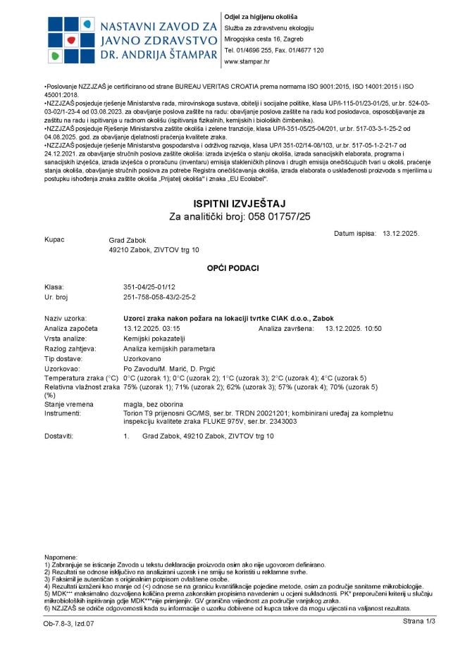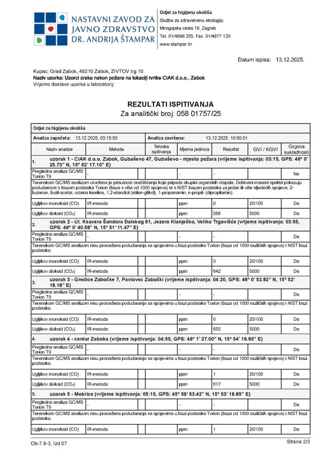 Iz Grada Zaboka medijima je upravo dostavljen Nalaz Nastavnog zavoda za javno zdravstvo ''Andrija Štampar'', o kvaliteti zraka u Zbaoku i okolici, a nakon velikog požara, koji je sinoć buknuo u Zaboku, u tvrtki CIAK.