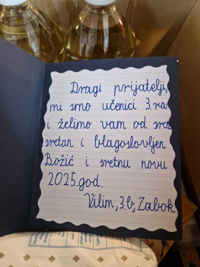 Na prijedlog predstavnice roditelja, a pod budnim okom učiteljice Biserke Krmek, učenici 3. b razreda izradili su prigodne rukom pisane i ukrašene čestitke za korisnike, a za najmanje pripremili prigodne poklone. Svojim su doprinosom ovoj akciji željeli poručiti korisnicima, a napose starijima, kako nisu sami. “Dragi prijatelji, mi smo učenici 3. b razreda i želimo vam od srca sretan i blagoslovljen Božić i sretnu novu 2025. godinu”, napisali su učenici, a tu čestitku upućuju i volonteri župnog Caritasa Zabok.