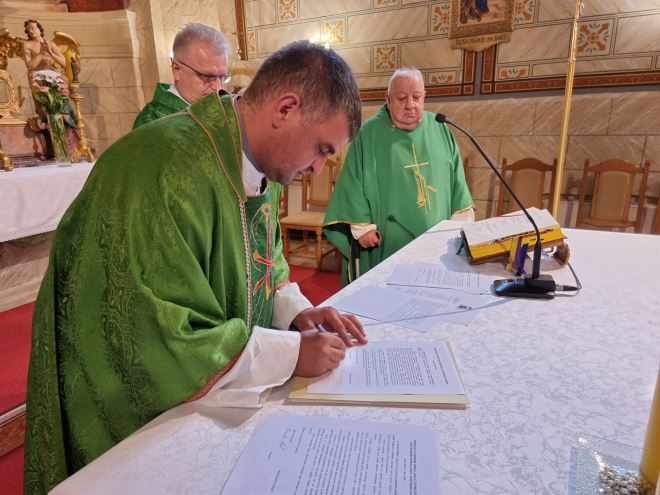 Obred uvođenja u službu novoga župnika započeo je odmah na početku euharistijskog slavlja čitanjem Dekreta o imenovanju župnika vlč. Riseka kojeg je pročitao vlč. Marijan Culjak, dugogodišnji zabočki župnik te novoimenovani supsidijar ove župe, a ujedno je pred svim vjernicima pročitana njegova biografija i dosadašnji rad u pastoralu. Novi župnik je položio ispovijest vjere i župničku prisegu te uz dvojicu svjedoka potpisao dokument o preuzimanju župe.