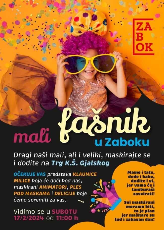 Sutra će se u Zaboku održati mali fašnik na Trgu Ksavera Šandora Glajskog i to s početkom u 11 sati.
