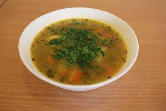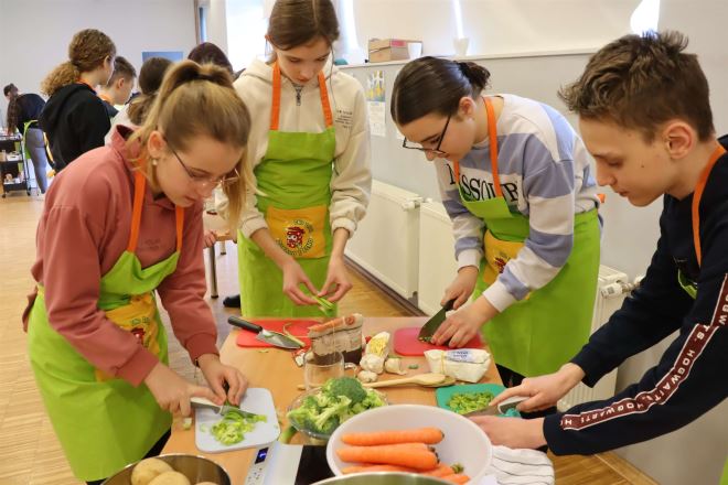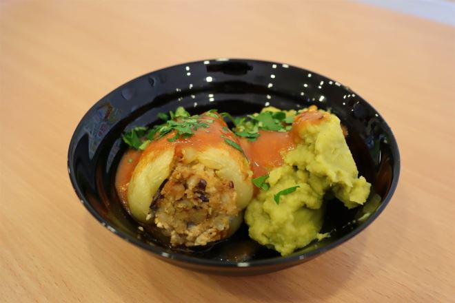 Za ručak je pripremljena povrtna gusta (minestrone) juha sa sezonskim povrćem (brokula, grašak, mrkva, poriluk) obogaćena noklicama od bezglutenskog pirova brašna. Veganske punjene paprike sa zelenim pireom od suhog graška, umjesto klasičnog krumpira, laganija su varijanta djeci dragog tradicionalnog jela.