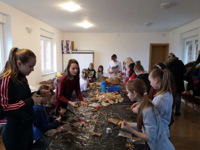 Djeca su ovoga puta izrađivala blagdanske ukrase od perušine i rafije, poput anđela, mašnica, zvijezda i slično, a izrađenim će prirodnim nakitom uoči Božića biti okićen poseban 'dječji bor' u župnoj crkvi.