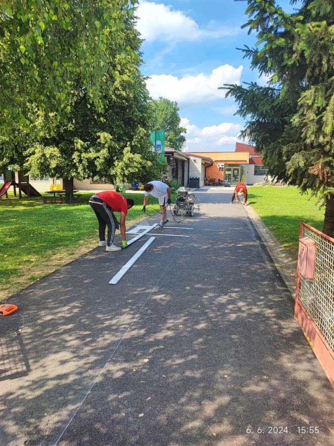 U četvrtak je izvršeno iscrtavanje prometnog poligona na prilaznoj stazi Dječjeg igrališta koji sada predstavlja novi tematski prostor za učenje i igru. Djeca će kroz igru u sigurnom prostoru moći naučiti pravila ponašanja na prometnici te kako sigurno prelaziti cestu preko pješačkog prijelaza te kretanje u prometu malim vozilima.