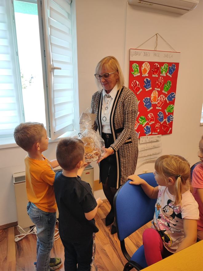 Djeca su izradila i načelnici poklonila veliki plakat „Ljubav djeci prije svega“ sa porukama o pravima djece i ukras za radni stol od prirodnih materijala, a načelnica je djecu obradovala košarom punom potrošnog materijala (bojice, škarice, tempere, kolaž, valjci, ljepila, modlice, papir) i kutijom punom slatkiša. Kroz razgovor o sreći, prijateljstvu, vrtiću i još mnogim zanimljivim temama, a za kraj općinskom zgradom odjeknula je dječja pjesma „Što se u vrtiću radi?“.