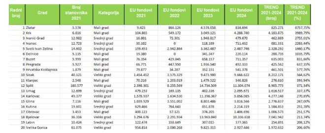 Osim Zlatara, u ovoj kategoriji istaknuli su se i Krk, Ivanić-Grad, Ivanec, Sveti Ivan Zelina, Delnice, Buzet, Pregrada, Hrvatska Kostajnica i Sisak, svi s rastom višestruko većim od početnog iznosa (u rasponu od 564,62 do 3989,79 posto). Ukupno je 56 gradova ostvarilo trend povećanja povučenih sredstava iz EU fondova od kojih 31 grad za više od 100 posto, 20 gradova za više od 200 posto, a njih 13 iznad 300 posto.