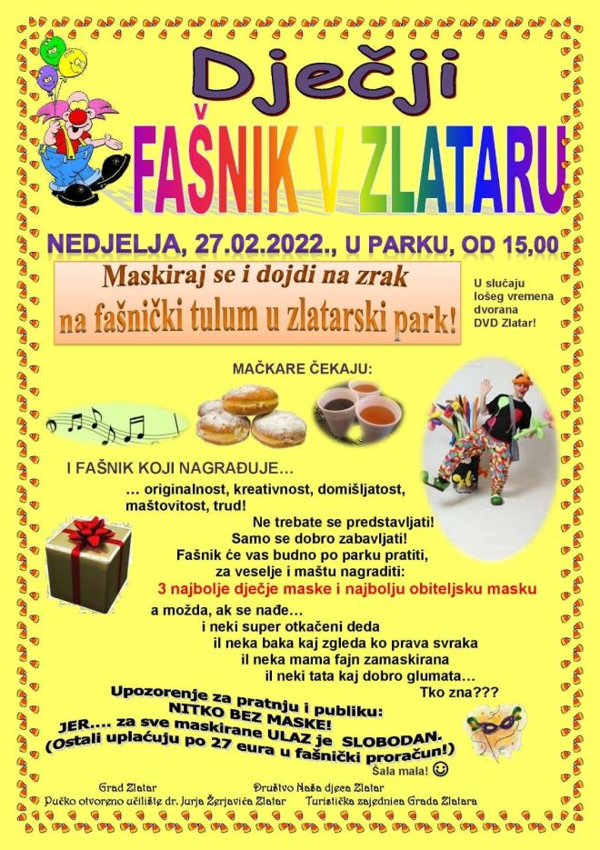 Maskiraj se i dojdi na zrak na fašnički tulum u zlatarski park! – pozivaju Društvo Naša djeca, Grad Zlatar, POU dr. Juraja Žerjavića i TZ grada Zlatara djecu i roditelje na Dječji fašnik v Zlataru. Fašnik će se održati nedjelju, 27. veljače, od 15 sati, u Parku hrvatske mladeži, a u slučaju lošeg vremna u Vatrogasnom domu. Birat će se tri najbolje dječje i najbolja obiteljska maska, a neće nedostajati ni krafni ni zabave.