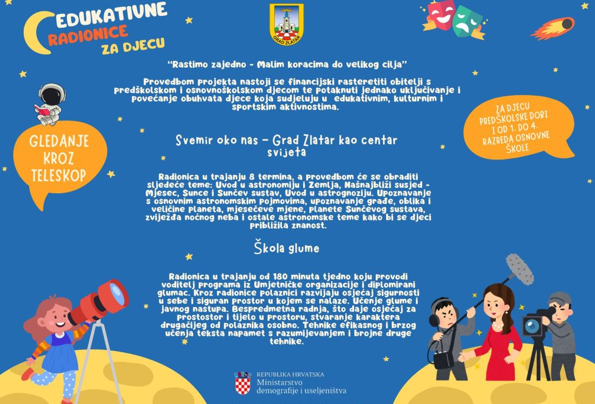 Cilj projekta bio je jasan –financijski rasteretiti obitelji i omogućiti svoj djeci, bez obzira na imovinski status, pristup kvalitetnim sadržajima. Taj cilj u Zlataru nije ostao samo na papiru. Zahvaljujući bespovratnim sredstvima u iznosu od 18.347,97 EUR, realizirane su aktivnosti koje su obogatile svakodnevicu djece i roditelja, a zajednici dale osjećaj ponosa i zajedništva. Ovaj projekt provodi se uz financiranje Ministarstva demografije i useljeništva.
