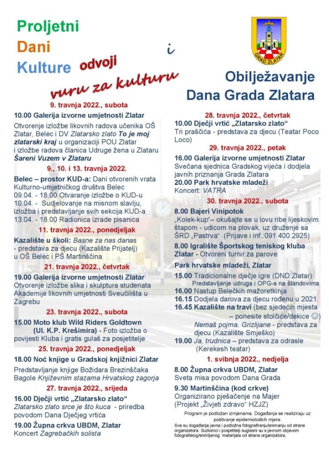 Istodobno u Belcu se održavaju Dani otvorenih vrata tamošnjeg KUD-a, a u srijedu, 13. travnja, organizira se radionica izrade pisanica, s početkom u 18 sati. Za 21. travnja u zlatarskoj Galeriji najavljena je izložba slika i skulptura studenata zagrebačke Akademije likovnih umjetnosti. I tako gotovo svakoga dana po sadržaj, sukladno sloganu organizatora „odvoji vuru za kulturu“. Manifestacija će završiti 1. svibnja, organiziranim pješačenjem na Majer, što je dio projekta „Živjeti zdravo“.