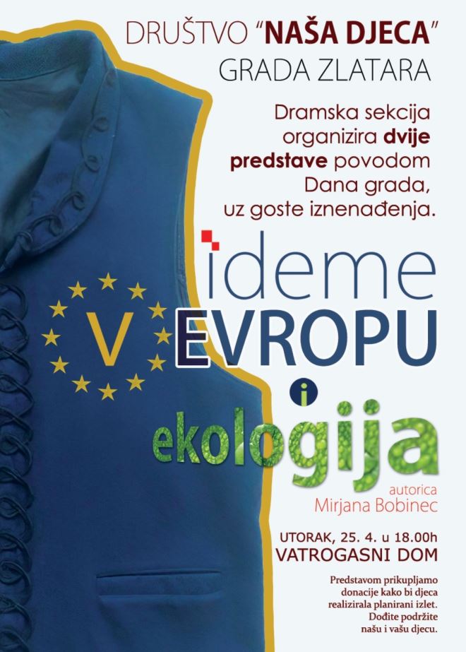 Društvo "Naša djeca" grada Zlatara poziva sve u utorak 25.4. U 18 h u vatrogasni dom na dvije predstave koje su pripremili povodom Dana grada. Uz predstave pod nazivom "Idemo v Evropu" i " Ekologija " autorice Mirjane Bobinec dolazi i zlatarska spisateljica koja će pročitati par svojih pjesama . Podržite rad Udruge i njihovih najvrjednijih članova djece te dođite pogledati zanimljive predstave, poručuju iz Društva "Naša djeca" grada Zlatara.