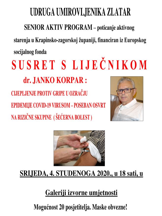 O cijepljenju protiv gripe u ozračju epidemije COVID-19 virusom, s posebnim osvrtom na rizične skupine (bolesne od šećerne bolesti), govorit će se na tribini „Susret s liječnikom“. Organizira ju Udruga umirovljenika Zlatar, u kojoj su organizirani ne samo umirovljenici s područja Grada Zlatara, nego i susjednih općina Mače i Lobor. Tribina će se održati danas, 4. studenoga, s početkom u 18 sati, u Galeriji izvorne umjetnosti Zlatar. Uz primjenu epidemioloških mjera, uz obvezne zaštitne maske, moguće je sudjelovanje 20 posjetitelja. Tribina se organizira u sklopu Senior aktiv programa – poticanje aktivnog starenja u Krapinsko-zagorskoj županiji, financiranog iz Europskog socijalnog fonda, u sklopu kojega je 23. listopada u Zlataru održana i tribina s temom „Raspolaganje imovinom za života i nakon smrti“, o kojoj je govorila odvjetnica Vinka Brundula Tadić.