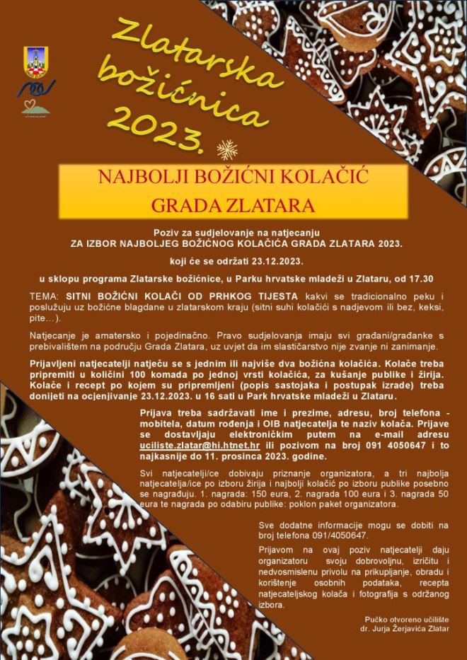 Grad Zlatar poziva Zlatarščanke i Zlatarščane da se prijave za sudjelovanje na 1. izboru najboljeg božićnog kolačića Grada Zlatara koji će se održati u sklopu programa Zlatarske božićnice u subotu, 23. prosinca 2023. u Parku hrvatske mladeži u Zlataru.