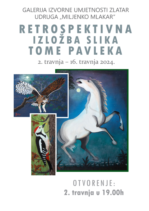 Zlatarska gradonačelnica, Jasenka Auguštan Pentek, u utorak je u zlatarskoj Galeriji izvorne umjetnosti otvorila prvu samostalnu, ujedno i retrospektivnu, izložbu Tome Pavleka. Član Udruge „Miljenko Mlakar“, rođen 1951. godine u Ratkovcu, prvi se put likovno predstavio svojim sugrađanima, izloživši 32 svoja likovna rada nastala u vremenu od 1988. do današnjih dana. Predgovor u katalogu napisala mu je snaha, akademski likovno obrazovana Birgit Brlečić Pavlek, koja predaje likovnu kulturu u zlatarskoj Srednjoj školi i Osnovnoj školi Belec. I sama vrsna slikarica, naglasila je: „Slikarstvo Tome Pavleka u svojem tradicijskom zaokretu, u kompozicijskoj harmoniji kao da proživljava svoju kreativnu mladost, uspješno se noseći s vanjskim znacima vremena…Ukazala se napokon prilika da se nakon 36 godina nominalno osvrne na svoja djela prve „retrospekcije“.
