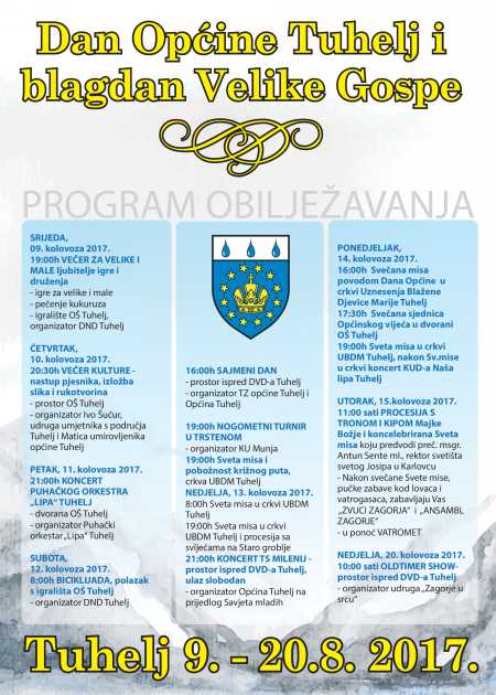 U ponedjeljak 14. kolovoza će se povodom Dana Opčine u crkvi Uznesenja Blažene Djevice Mariaj održati svečana misa, a u 17:30 će se održati svečana sjednica Općinskog vijeća u dvorani OŠ Tuhelj. Nakon svete mise koja će se održati u 19 sati, u crkvi će se održati koncert KUD-a Naša lipa Tuhelj.