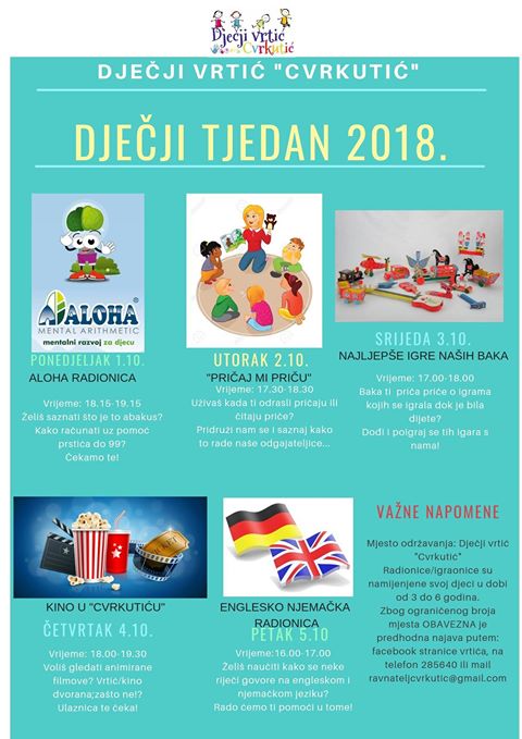 U ponedjeljak 1. listopada održat će se Aloha radionica od 18 i 15 do 19 i 15 sati, sljedeći dan će održati radionica 'Pričaj mi priču' od 17:30 do 18:30 sati. U srijedu 3. listopada održat će se prezentacija najljepših igra naših baka i to od 17 do 18 sati.