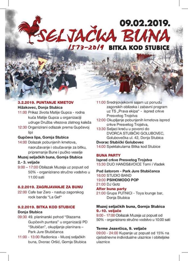 Direktorica Turističke zajednice područja Donja Stubica i Gornja Stubica Kornelija Vnučec govorila je o programu. - Iduću nedjelju 3. veljače počinje puntanje kmetov, u 11 sati bit će prikaz života Matije Gupca u rodnom selu u Hižakovcu. U 12.30 počinje organizirani odlazak prema Gupčevoj lipi gdje se oko 14 sati očekuje dolazak seljaka i nakon toga počinje pobuna kmetova, naoružavanje i obučavanje za bitku, a potom slijedi pučko veselje - objasnila je Vnučec, dodavši kako 9. veljače program počinje ujutro u 11 održavanjem srednjovjekovnog sajma, a već u 9.30 počinje tradicionalni 49. pohod planinara 'Stazama Gupčevih puntara' u organizaciji PD Stubičan. - Od 11 sati počinju se skupljati seljaci kod crkve Presvetog Trgojstva. Oko 12.30 kreće povorka prema Stubičkom Golubovcu gdje će se u 14 sati održati spektakulrna Bitka kod Stubice. Nakon bitke kreće Buna party od 15.30 uz zabavni program ispred šatora i ispred crkve, a posjetitelje će zabavljati Du HANDS&VOICE Tomi i Vladek, Studio bend. Koncert Psihomodopopa počinje u 19 sati, a nakon toga tu je DJ Gotz koji će zabavljati do jutarnjih sati.
