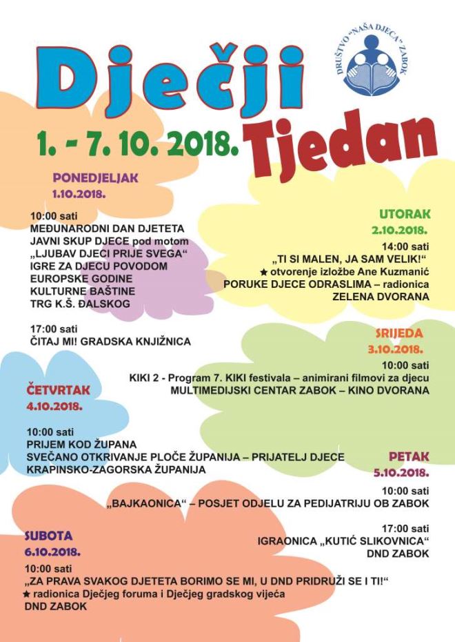 Društvo „Naša djeca“ Zabok Dječji tjedan 2018. obilježava raznolikim programima za djecu. Prvoga će se dana na Trgu K.Š. Đalskog u Zaboku, na Međunarodni dan djeteta, za djecu Dječjeg vrtića Zipkica i Osnovne škole K.Š. Gjalskog organizirati novo osmišljene igre nastale na radionicama DND-a Zabok povodom obilježavanja Europske godine kulturne baštine. U Dječjem će tjednu s radom započeti Program „Čitaj mi!“, Igraonica „Kutić slikovnica“, organizirat će se zanimljiva izložba i radionica na temu „Poruke djece odraslima“, program KIKI festivala, „Bajkaonica“ za djecu na dječjem odjelu Opće bolnice Zabok te radionica Dječjeg foruma i Dječjeg gradskog vijeća na temu „Za prava svakog djeteta borimo se mi, u DND pridruži se i ti!“.